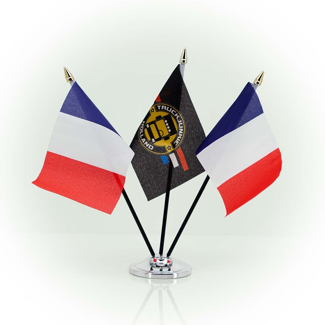 FLAG-FR flag er en kompakt og stilfuld tilføjelse til enhver lastbil. Med en størrelse på 10 x 15 cm passer dette flag perfekt i begrænsede rum, mens de iøjnefaldende farver giver et elegant udseende. Flaget er udstyret med en sort plaststander og en guldfarvet mastetop, hvilket bidrager til holdbarheden og det stilfulde design.