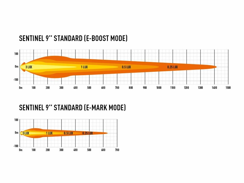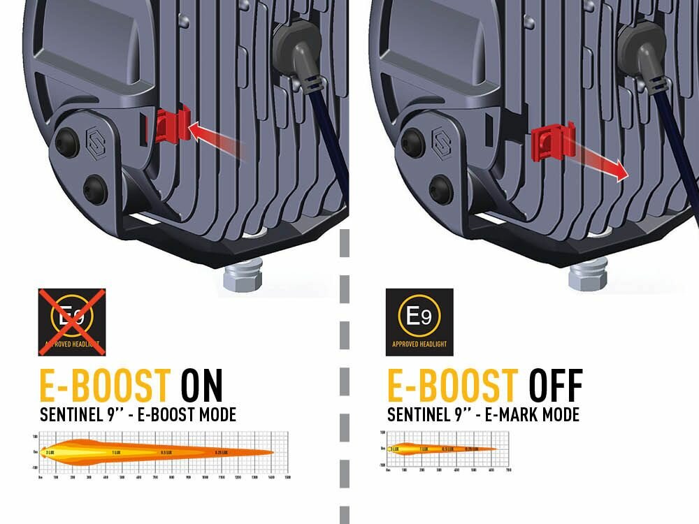 Der Sentinel ist E-genehmigt R112, aber die E-boost Funktion muss deaktiviert werden, um diese Genehmigung zu erfüllen. Dies reduziert die Helligkeit auf das zulässige Limit.