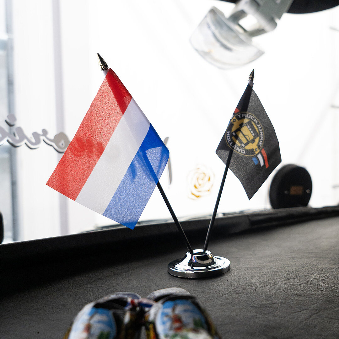 This flag is specially designed for truck styling and offers a stylish addition to your cabin. With dimensions of 10 x 15 cm, this flag is compact and easy to place in various spots in your truck. The flag features a black plastic stand for stability and a gold-colored masthead for an elegant appearance.