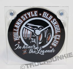The HOLLAND STYLE Front Plate Set Old Skool Club is a handmade lightbox perfect for truck styling. With dimensions of 18x18 cm and supplied with two suction cups, this lightbox is easy to attach. The product combines attractive design with high-quality lighting, offering a reliable and stylish solution.