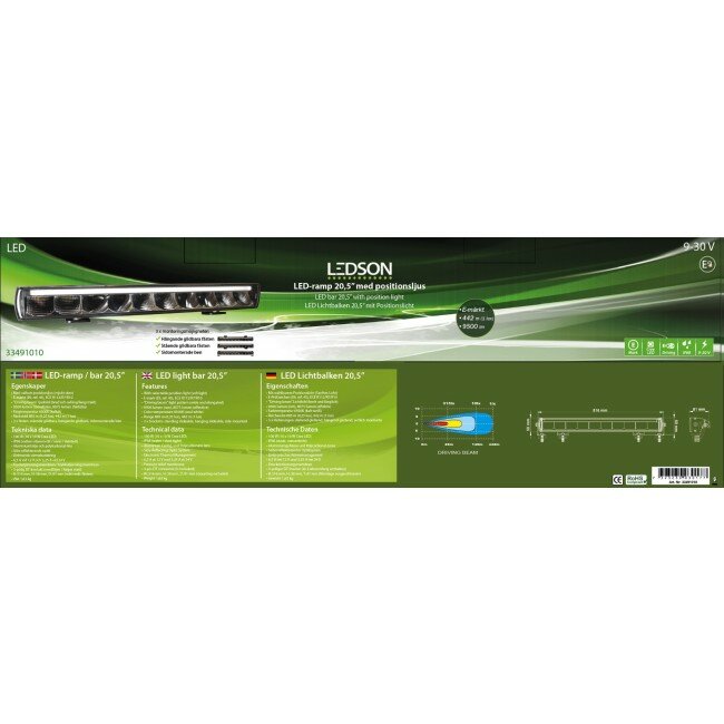 The Ledson LED-Bar Titan Drive offers powerful lighting with an output of 9500 lumens and a power of 100W. This light bar is equipped with an E-mark and position light, providing extra visibility and safety. With dimensions of 516x58x81mm, it is compact and easy to install. Ideal for truck styling and improved driving conditions, especially in dark or poorly lit areas.