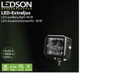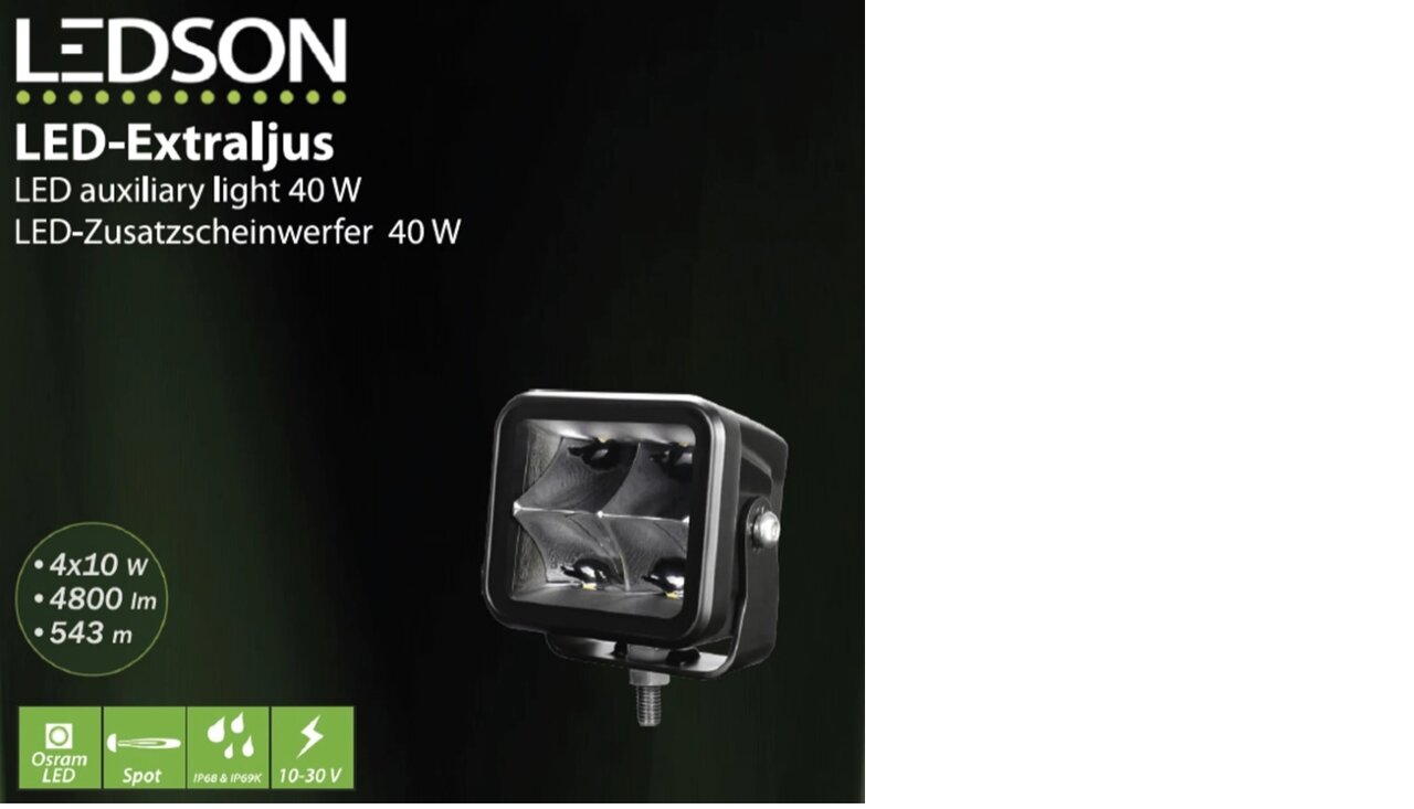The Ledson Vega S is a compact LED spotlight with a modern appearance. Equipped with 4x10W Osram LEDs, it delivers 4800 lumens at a color temperature of 5700K. The lamp is resistant to harsh conditions thanks to the IP68/IP69K rating. Advantages include high light output and durability. Dimensions are compact, ideal for limited spaces.