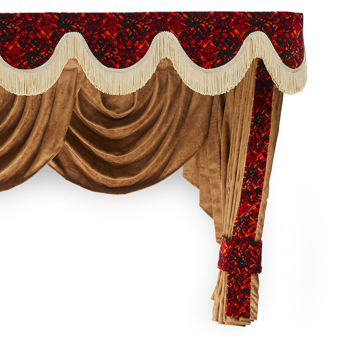 Upgrade je interieur met deze complete luxe gordijnset, inclusief zijgordijnen, voorraamband, 3-bogen booggordijn en kussen.