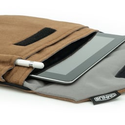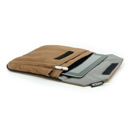 Protect your tablet with the handmade Omnius tablet case. This case is made from brown Alcantara-look material and offers stylish and durable protection. The practical Velcro closure ensures secure and easy access to your tablet. The case features a handy front pocket and two pen slots, making it not only elegant but also functional.