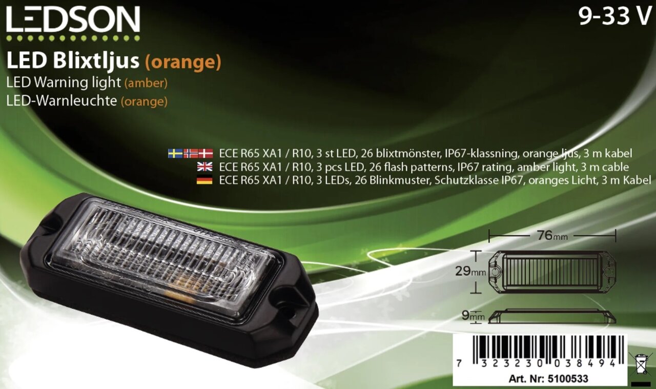 Orange Warning Flash Light 3 LEDs 26 Flash Patterns ECE R65 EMC R10 IP67 9-33V 3m Cable