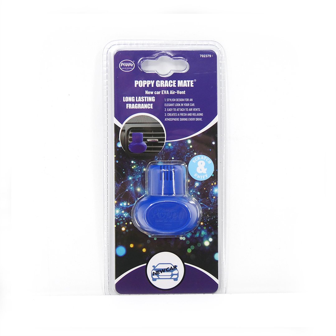 This Poppy Grace Mate EVA air freshener with a soothing New Car scent is designed for easy attachment to your vehicle's air vent. The included clip ensures quick installation and activates the scent as soon as the airflow begins.