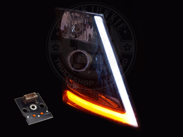 Transformeer de standaard witte dagrijlichten van je Volvo FH vanaf 2012 naar opvallende Amerikaanse LED wit/oranje lichten. Deze set vervangt alleen het onderste originele plaatje, waardoor het installeren simpel blijft.