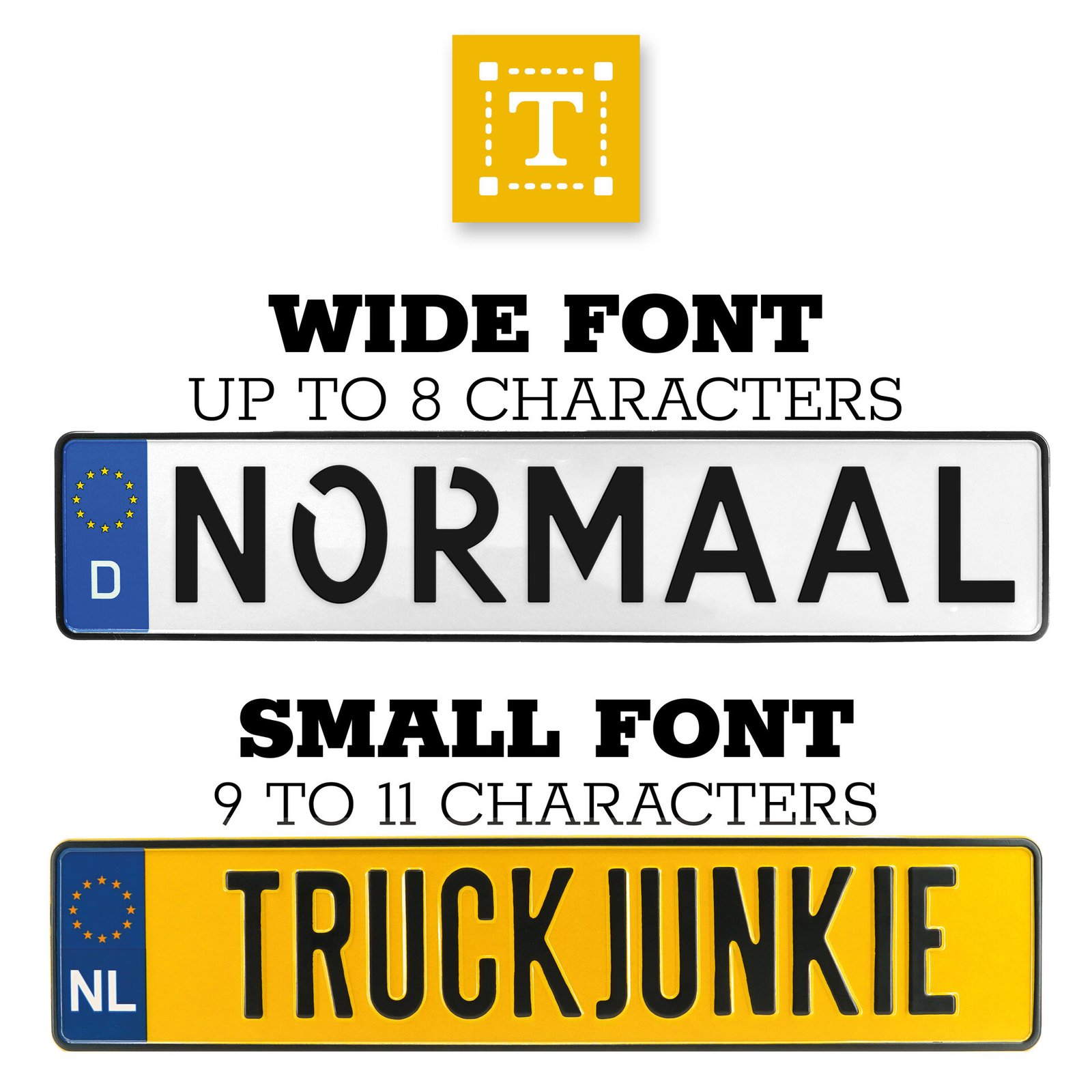 Geef je voertuig een persoonlijke touch met deze unieke kentekenplaat. Voeg je eigen tekst toe en maak je vrachtwagen of voertuig echt van jou. Bestel Direct Online!