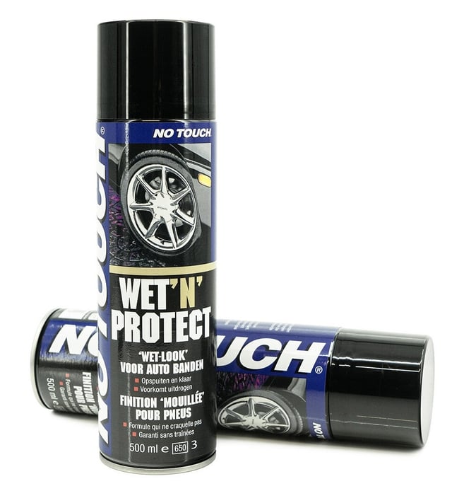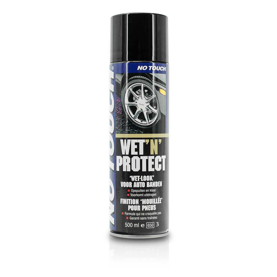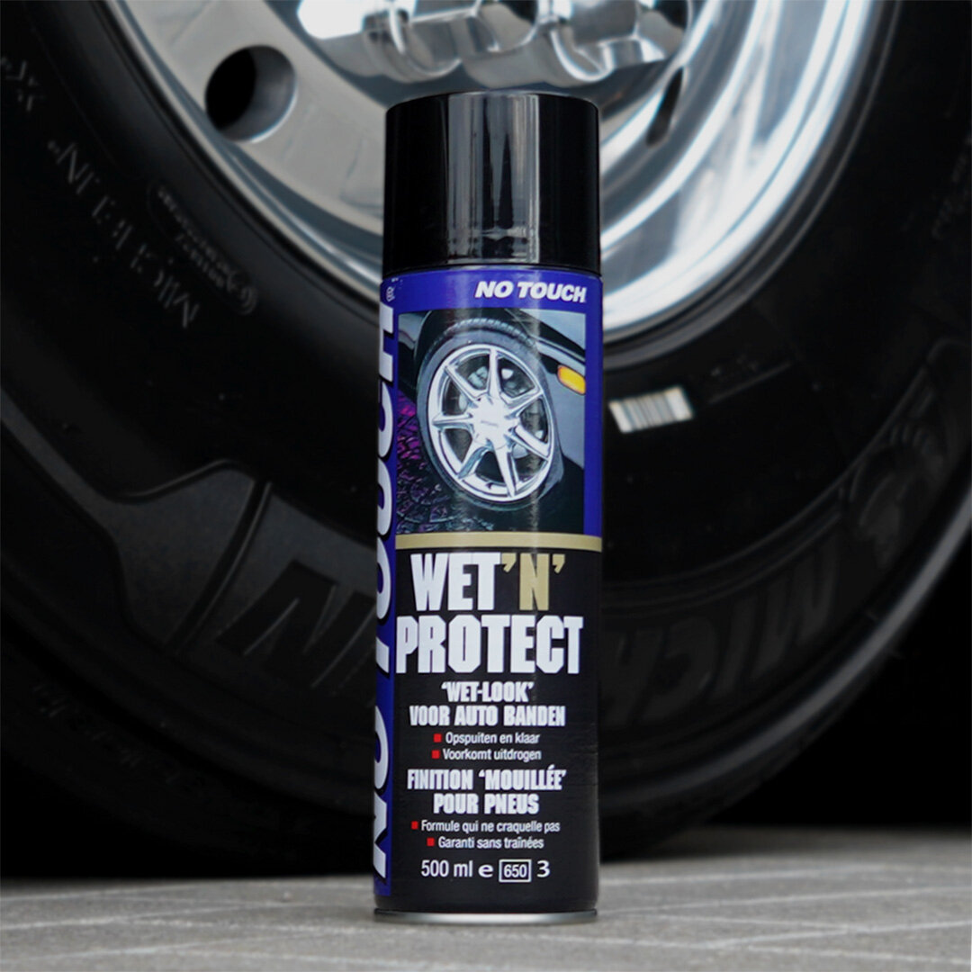 No Touch Bandenzwart Wet 'n' Protect Wet Look Spray 500 ml is perfect voor wie zijn banden wil laten opvallen. Met deze spray geef je je banden een opvallende glans en voorkom je uitdroging. De spray is makkelijk aan te brengen en droogt snel, zodat je meer tijd hebt om te rijden.