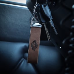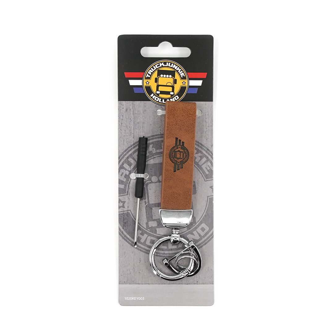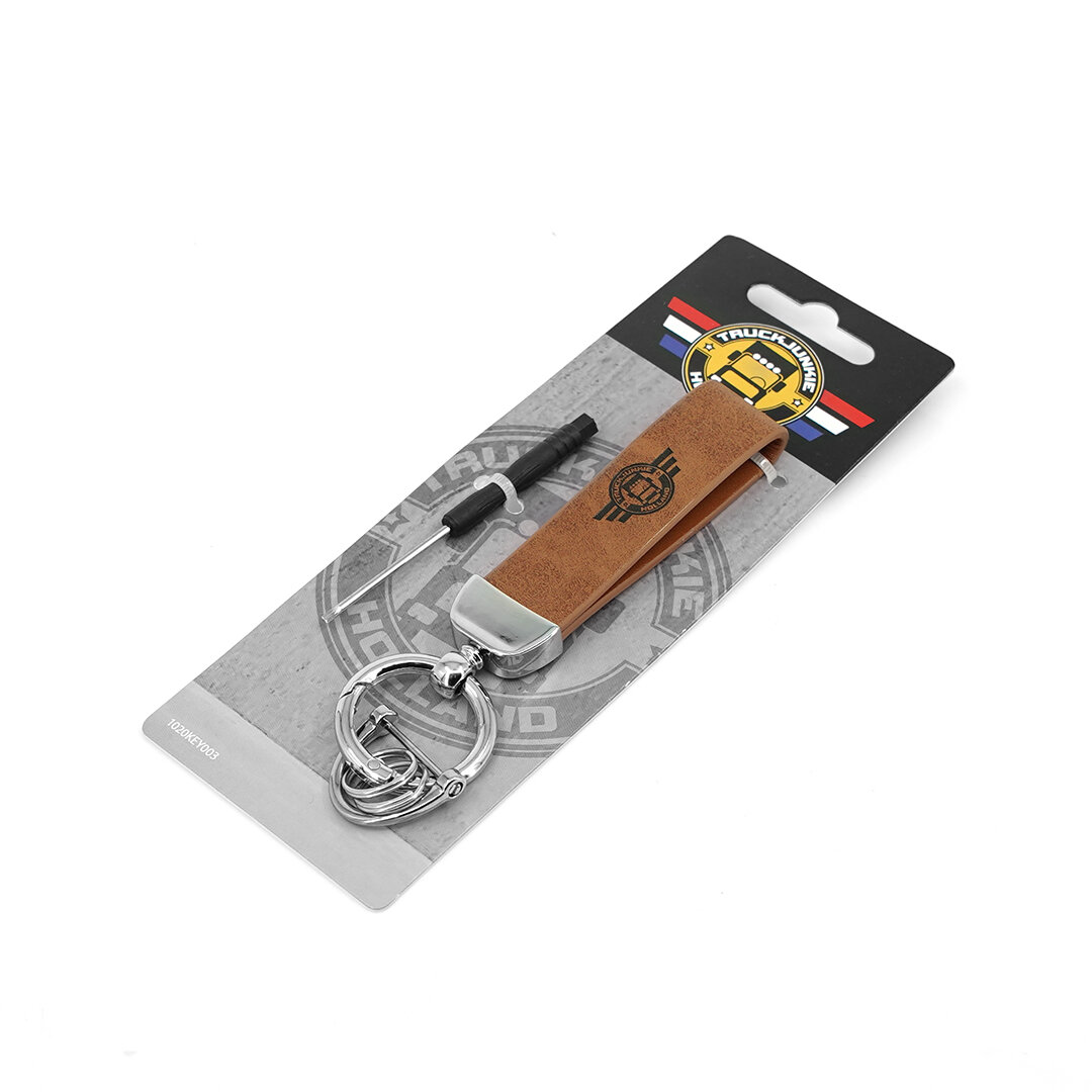 Bruine sleutelhanger met gegraveerd logo en handige ring. Leren look, premium gravure. Tijdloos design dat past bij elke trucker. Kwaliteit die je dagelijks in je handen hebt.