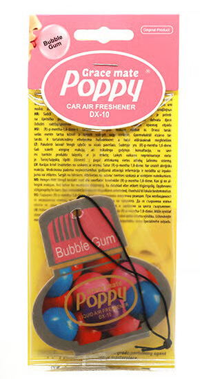 De Poppy Grace Mate geurhanger in Bubble Gum geur is ideaal voor chauffeurs die hun cabine willen stylen met een frisse geur. Hang hem eenvoudig op met het elastiekje, perfect passend om je achteruitkijkspiegel. Elke kleur van de iconische Poppy geurhangers staat voor een unieke geurbeleving.